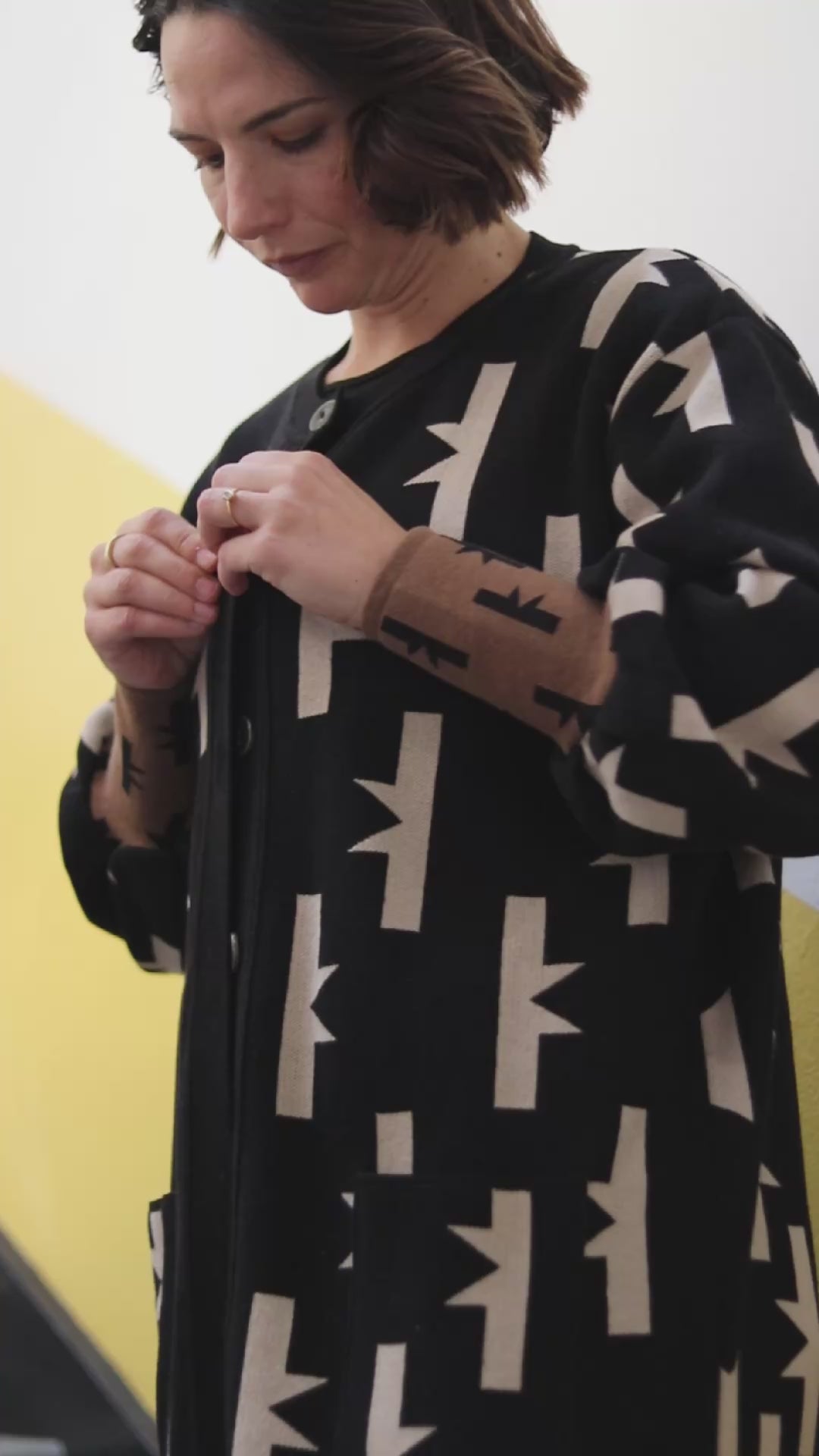 With its structured button-up front, oversized sleeves, and contrast ribbed cuffs, this coat is the perfect mix of art and everyday wear. The colorway keeps it sleek, while its embedded story makes it unforgettable.